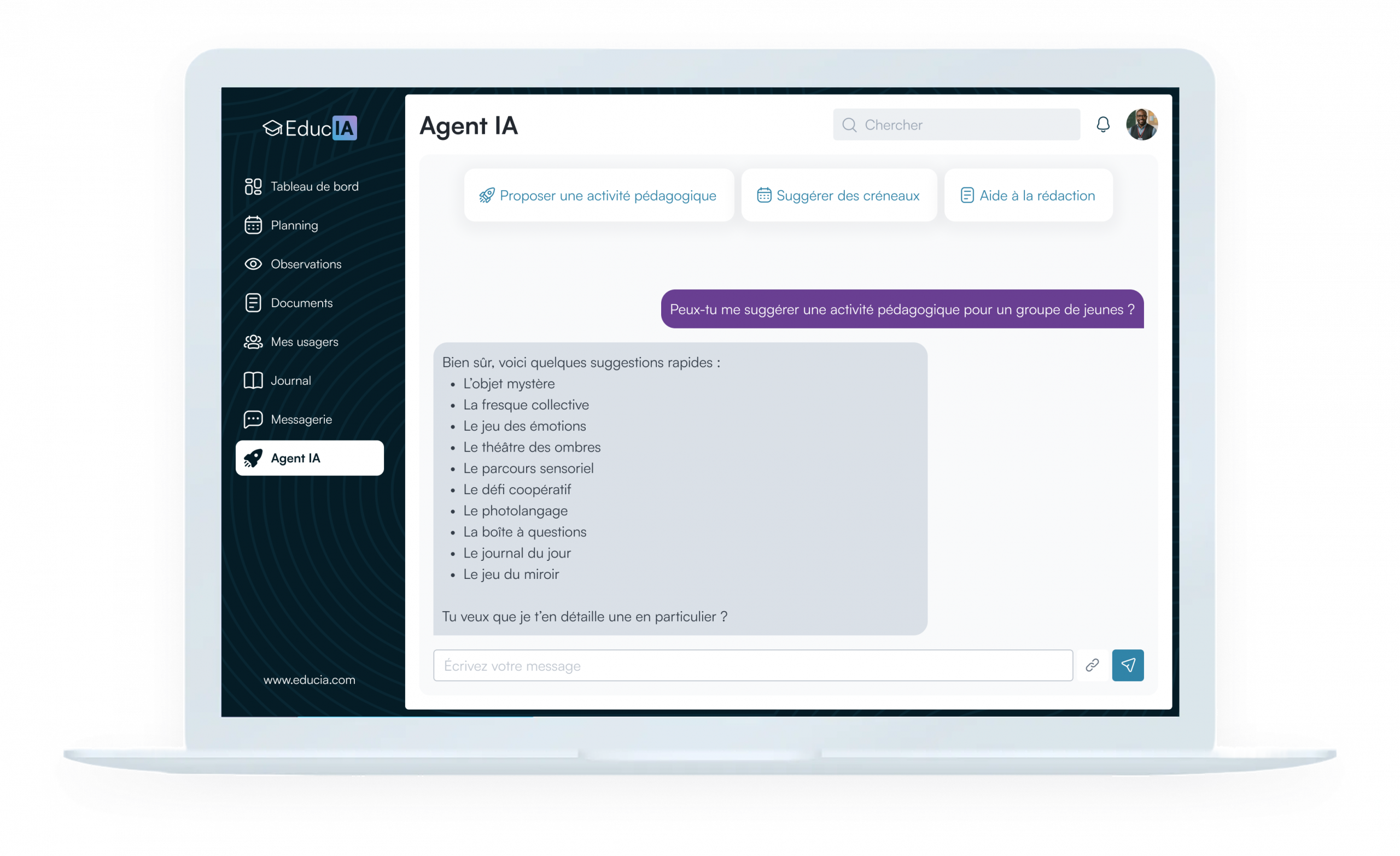 EducIA vous accompagne au quotidien dans la rédaction d’observations, la préparation des rapports et la consolidation des informations essentielles pour vos équipes. Une interface simple, sécurisée et adaptée aux réalités du terrain éducatif.