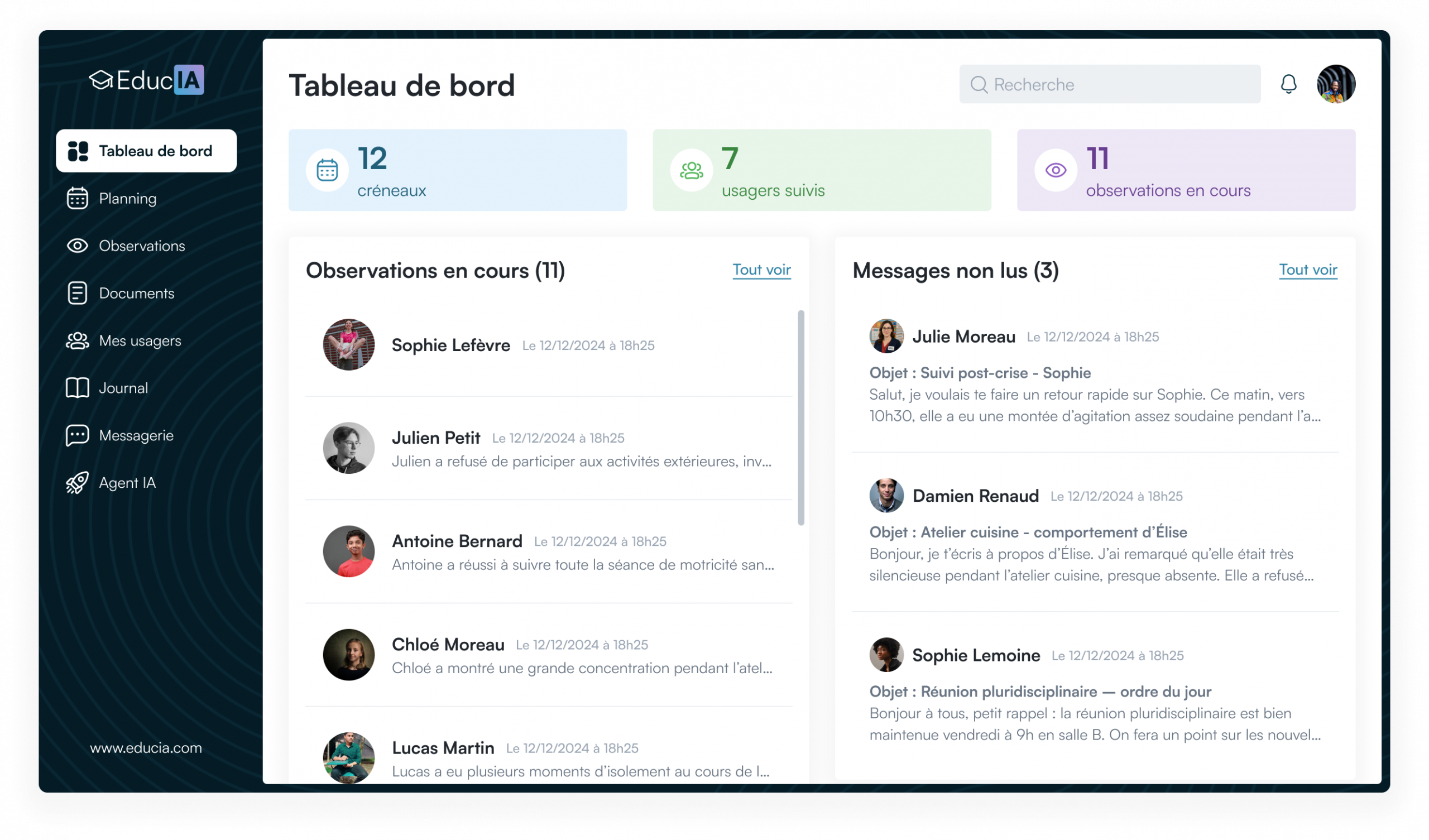 Visualisez les évolutions de vos usagers grâce à des résumés automatiques soulignant les réussites et les points de vigilance.